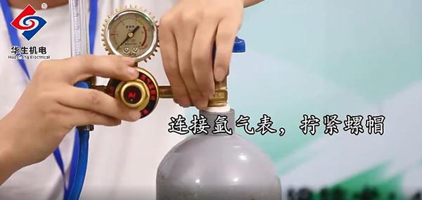 将氩气表与氩气瓶进行连接,可借助扳手拧紧螺帽,再将气管接入冷焊机背板的氩气接口。焊接时,打开氩气瓶阀门,调节氩气刻度即可。