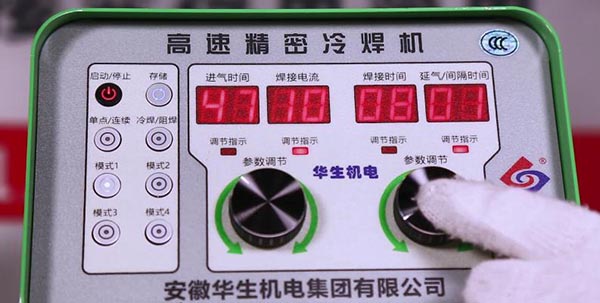 4、调节参数:根据焊接材料选择焊接模式,调节电流和时间。