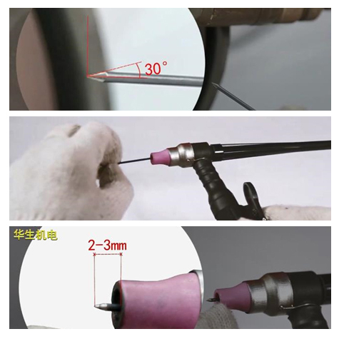 焊枪一般由陶瓷嘴、枪尾、导流件、钨针等耗材配件组成,冷焊机厂家发货时,焊枪都是没有组装的,需要自行组装。打磨钨针时,使钨针中轴线与打磨切面成30度角,超出陶瓷嘴2-3mm为宜。